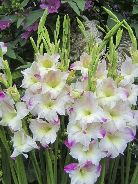 Les épis de ce glaïeul produisent 6 grandes fleurs blanches, maculées de rose violacé et gorge verte.
