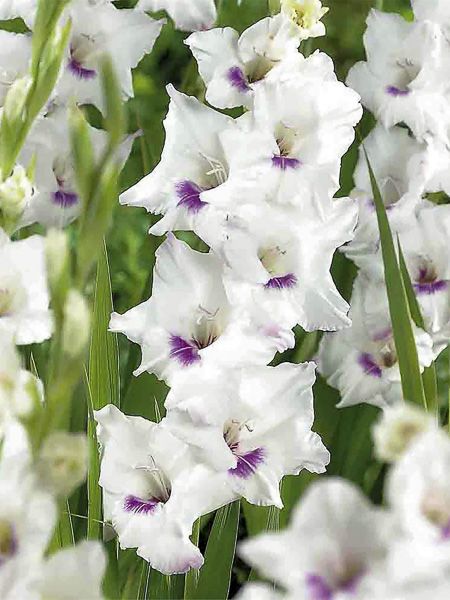 Glaïeul de grande classe aux fleurs blanches avec une macule violette.