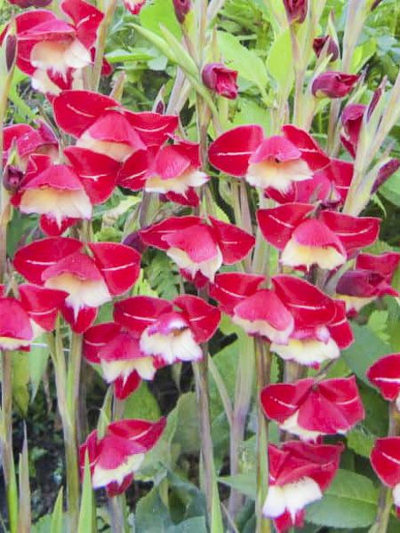 Glaïeul relativement bas, aux fleurs bicolores, rouge pourpré, maculées de crème sur les pétales inférieurs.