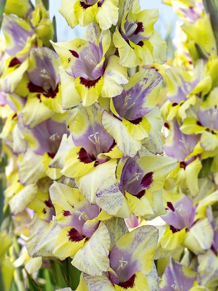 Glaïeul spectaculaire aux fleurs tricolores, jaune citron, mauve et pourpre.