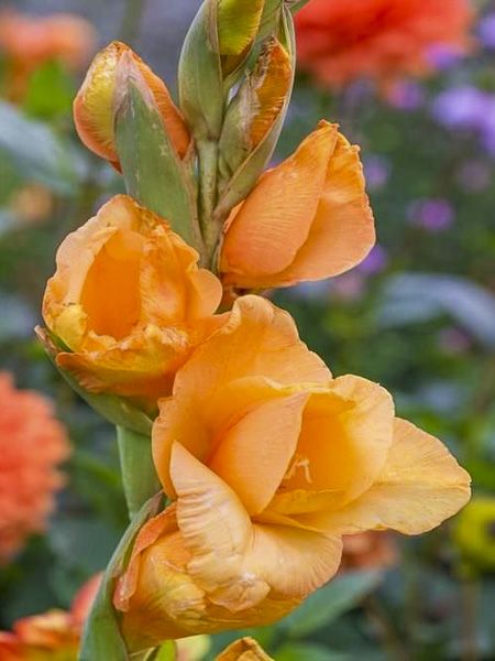 Le glaïeul, un bulbe d'été à redécouvrir avec les nouveaux cultivars aux coloris très variés : rouge, rose, jaune orange, violet, blanc, bicolore et même vert ou pourpre très foncé. Leur floraison, en hampe érigée, et leurs feuilles élancées seront du plus bel effet à l'arrière d'un massif, mélangé à d'autres vivaces. Plantez-les en groupe pour accentuer l'effet de masse. Bien entendu, ce sont des fleurs idéales pour constituer de hauts bouquets bien fournis. Pour la fleur coupée, vous pouvez les installer en ligne au potager. Le glaïeul n'est pas très exigeant : une terre classique de jardin, pas trop lourde et du soleil. Planter les bulbes (cormus) à 8 cm de profondeur, dès la fin du mois de mars jusqu'en juin pour obtenir une floraison échelonnée de fin juin jusqu'en octobre. En climat froid, il est préférable de les enlever de la terre, juste après les premières gelées, de les conserver dans un endroit frais et sec, pour les replanter au printemps.