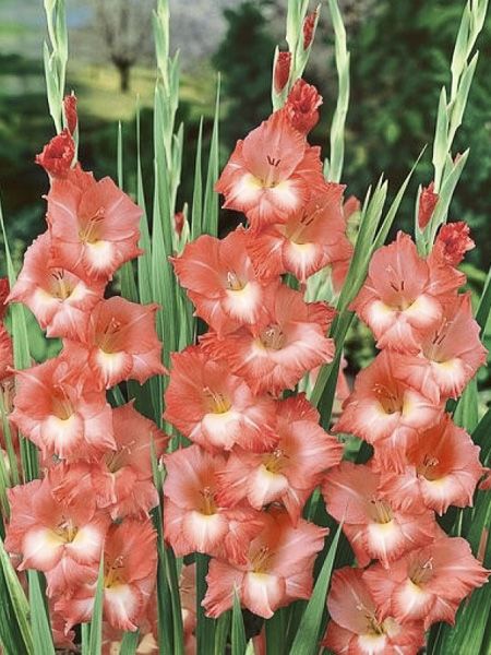 Ancienne variété de glaïeul aux grandes fleurs rose saumoné à gorge blanche.