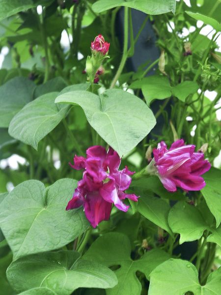 Cette ipomée hybride offre une des fleurs doubles, de 10 cm de diamètre, rose-rouge-magenta, à cœur blanc. À installer sur un grillage ou laisser courir au sol.