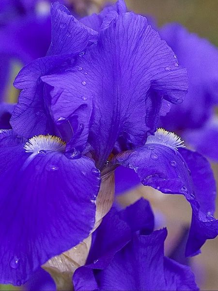 Fleurs unicolores bleu violacé riche. Barbe blanche poudré de jaune. Floraison de mi-saison à tardive.