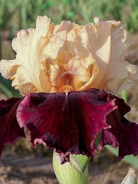 Iris des jardins aux fleurs ondulées. Sépales pourpre grenat. Pétales supérieurs saumon. Barbe rouge orangé. Floraison de mi-saison.