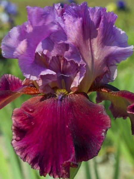 Iris des jardins aux fleurs ondulées. Sépales lie-de-vin. Pétales supérieurs lavande. Barbe jaune. Floraison de mi-saison.