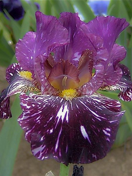 C'est l'iris barbu ou l'iris des jardins avec ses milliers de cultivars aux grandes fleurs très caractéristiques aux tons variant du blanc pur au (presque) noir, en passant par les toutes les gammes de bleu au violet, mais aussi rose, orange et jaune. Certains sont bicolores. On l'appelle "mange-cailloux". Quand vous les planter, il faut laisser à l'air libre environ 1/3 du rhizome. Cultivez-les dans une terre légère, pas trop riche, même caillouteuse et en plein soleil. Ne lui ajouter pas d'engrais azoté et ne l'arroser pas trop, sinon il produira de belles feuilles, mais peu ou pas de fleurs. Au bout de quelques années, les rhizomes du centre meurent après avoir fait des "petits" sur le bord. En juillet-août, il faut alors supprimer cette partie centrale, retirer les rhizomes sains et les replanter, si possible dans un autre endroit, car l'iris a tendance à épuiser le sol. Il arrive souvent, après la floraison, que les feuilles se tachent et deviennent moins esthétiques, cela ne nuit pas à la plante.