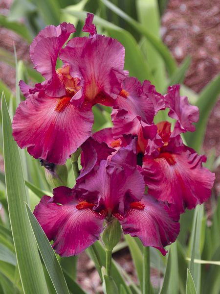 Iris des jardins aux fleurs framboise à rose grenat. Barbe orange. Floraison mi-tardive. Vigoureux et bien florifère.