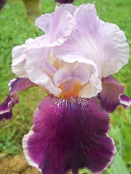Iris des jardins aux grandes fleurs. Sépales pourpre violacé marbré et borduré de lilas pâle. Pétales blanc lavé de rose. Barbe orange. Floraison de mi-saison.