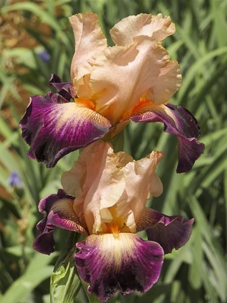 Iris des jardins aux fleurs ondulées. Sépales pourpre violacé à base abricot pâle. Pétales supérieurs abricot pâle. Barbe orange. Floraison de mi-saison.