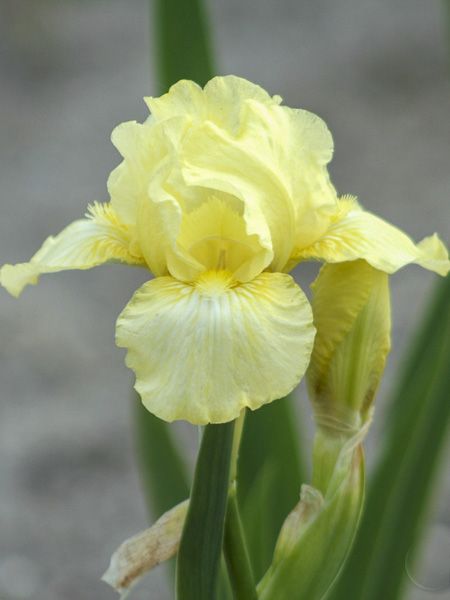 Iris des jardins nain aux fleurs ondulées jaune citron à jaune pâle. Barbe jaune. Floraison hâtive.