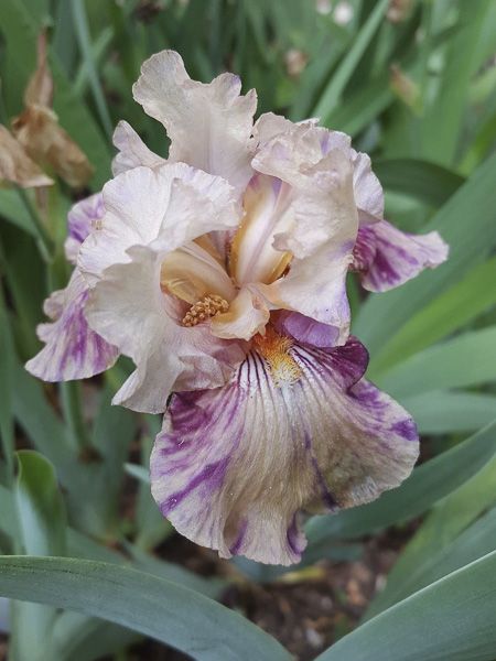 Fleurs rose-abricot très pâle zébré aléatoirement de pourpre violacé. Barbe mandrine. Légèrement parfumé. Floraison de mi-saison.