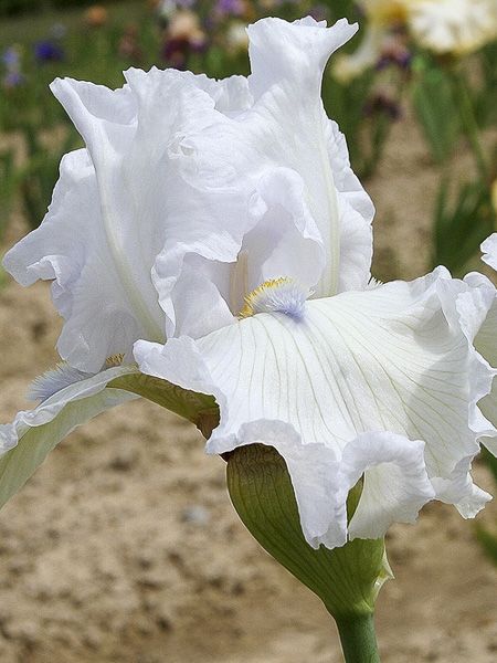 Iris des jardins aux fleurs très ondulées, légèrement parfumées, blanc éclatant, aux reflets bleus à l'éclosion. Barbe jaune et bleu pâle. Floraison hâtive.