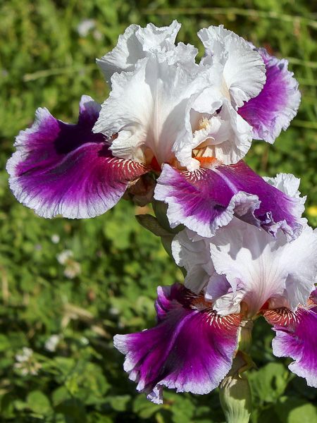 Iris des jardins aux fleurs très contrastées entre les pétales dressés blancs à reflets rose et les sépales pourpre violacé marginé de lavande pâle. Barbe mandarine. Floraison en mi-saison.