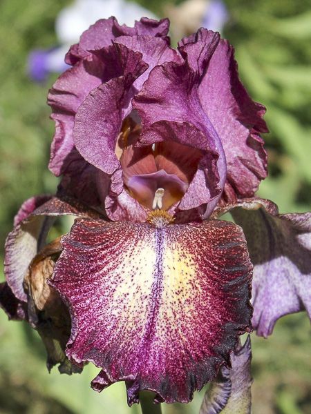Iris des jardins aux fleurs à sépales mouchetés et bordurées de pourpre sur fond jaune beurre. Pétales supérieurs rose pourpré. Barbe jaune. Floraison de mi-saison.