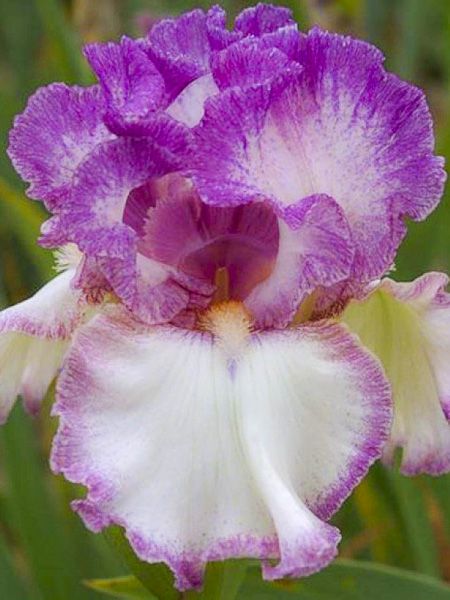 Iris des jardins aux fleurs ondulées. Sépales et pétales blanc bordé de rose orchidée. Barbe blanche à orange. Floraison hâtive.