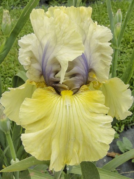 Iris des jardins aux fleurs ondulées. Sépales jaune chartreuse. Pétales supérieurs flammés de lavande. Barbe jaune orangé. Floraison hâtive.