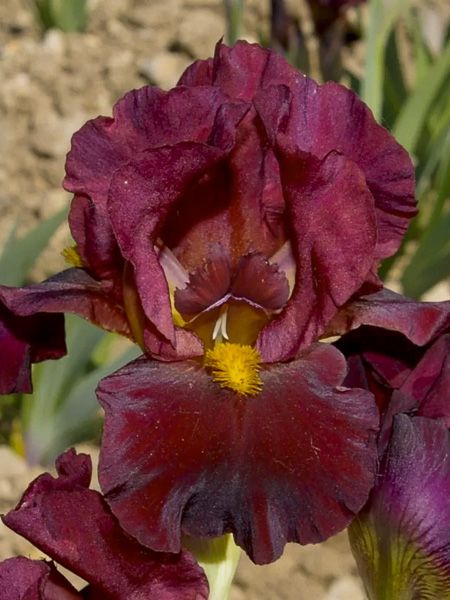 Fleurs unicolores rouge grenat brunâtre. Barbe jaune d'or. Floraison de mi-saison.