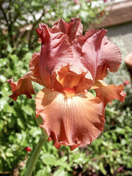 Iris des jardins aux fleurs ondulées orange-rouge cuivré. Barbe rouge corail. Floraison de mi-saison.