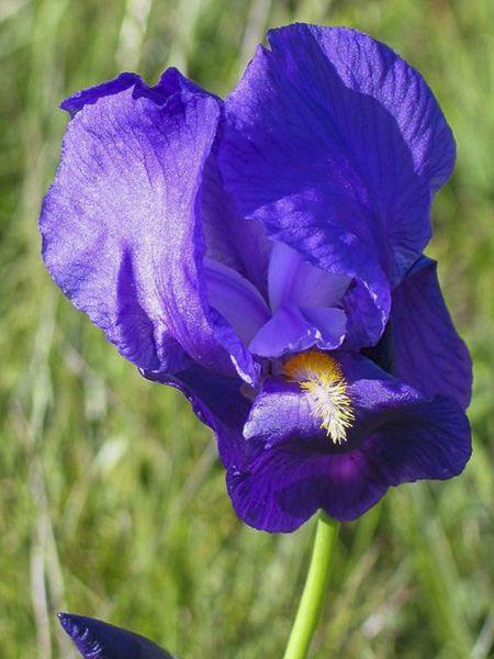 Iris botanique proche de Iris pallida, aux fleurs bleu violacé satiné à cœur crème et barbe orage à blanche. Pour bordure ou rocailles.