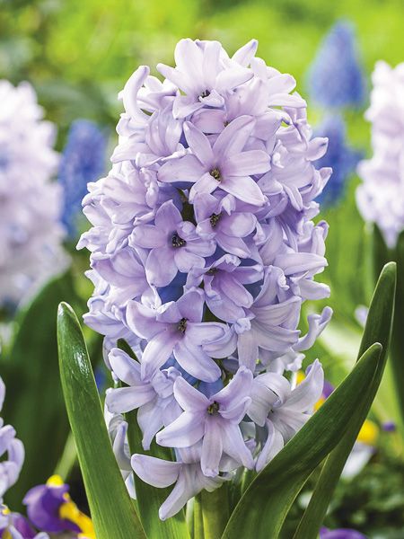 Jacinthe aux denses épis de fleurs parfumées, aux tons pastels rose lilas très pâle, aux reflets bleu argenté.