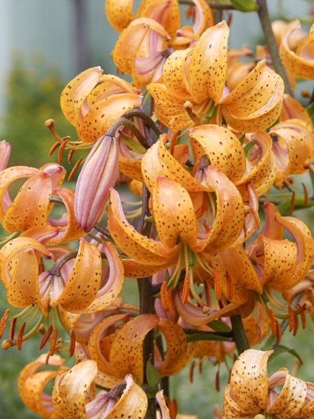 Jusqu'à 20-30 fleurs pendantes, révolutées. Pétales orange abricot ponctuées de brun pourpré. Vigoureux, se naturalise bien.