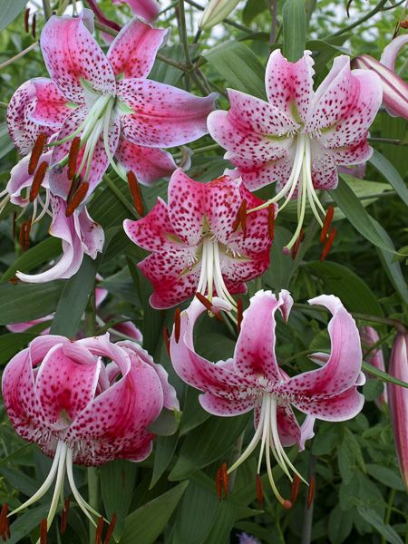 Lis robuste aux fleurs en turban rose-rouge cramoisi, borduré de blanc et ponctué de pourpre. Culture en sol acide, à mi-ombre.