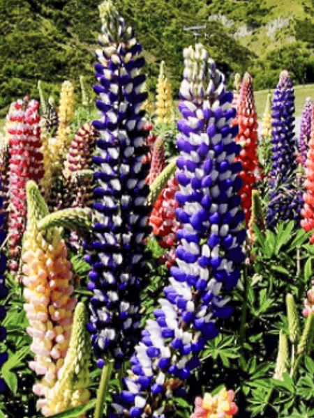 Lupin hybride vivace, aux épis de fleurs en mélange de couleur crème, rose, orange, bleu et violet, unies ou bicolores.