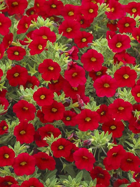 Mini-pétunia de la série Million Bells aux fleurs rouge intense, de la fin du printemps jusqu'aux gelées.