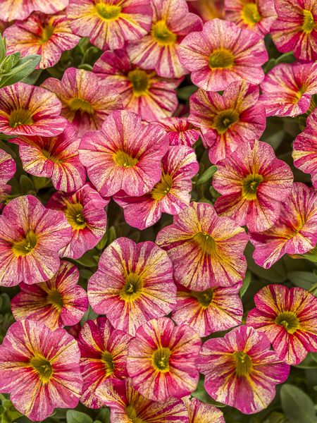 Mini-pétunia de la série Superbells en coussin aux fleurs rouge, irrégulièrement strié de jaune et d'orange, de la fin du printemps jusqu'aux gelées.