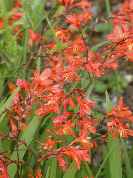 Mi-bulbe, mi-souche, ces plantes sont les plantes de lété. Faciles à cultiver, vigoureuses, peu exigeantes, elles se plantent au soleil en sol fertile. A la fin de l'été, les fleurs apparaissent sur des tiges dressées ou horizontales au mlieu du feuillage rubanné en gerbe assez dense. Les fleurs sont composées de 3 pétales internes et 3 pétales externes. Leurs coloris éclatants, jaune, orangé ou rouge égayent bien les jardins. Les fleurs des cultivars sont souvent ponctuées de brun, de rouge foncé ou de violet. Les Crocosmia n'aiment pas du tout la sécheresse estivale qui diminue leur floraison et les rendent plus sensibles aux maladies. Ils sont splendides en association avec des annuelles ou des arbustes.