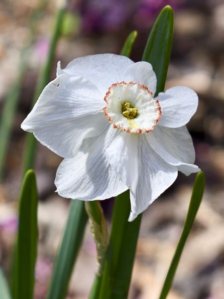 Fleurs blanches, à petite couronne évasée blanche à liseré orange-rouge.