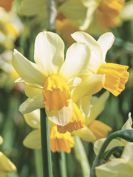 Nain et hâtif. Tiges produisant 3 à 5 petites fleurs à corolle jaune tendre et couronne orangée.