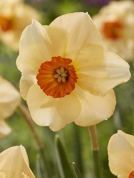 Larges corolles orange cuivré pâle. Petite couronne orange, presque rouge.