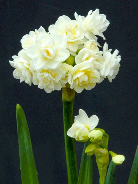 Poetaz multiflore. Fleur double, ivoire à centre jaune pâle. Très florifère.