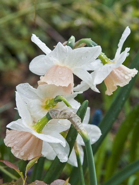 2 à 3 petites fleurs par tige, à corolle blanche et couronne rose chair à abricot.