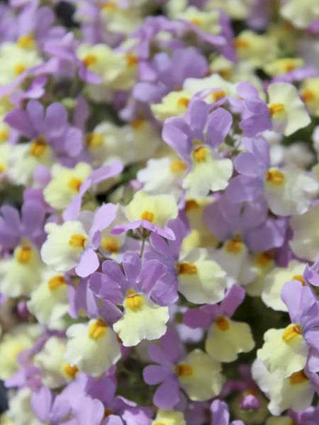 Némésie aux fleurs lilas et jaune pâle, à cœur orange. Floraison continue du milieu du printemps au début de l'automne