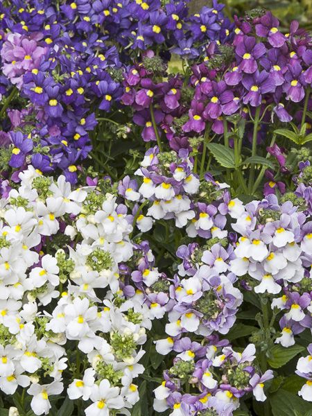 Némésie aux fleurs en mélange de couleur, blanc, lilas, violet, uniforme ou bicolore. Floraison continue du milieu du printemps au début de l'automne
