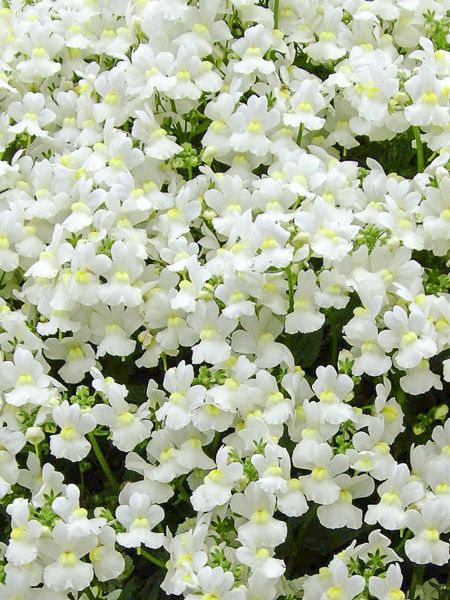 Némésie compacte aux fleurs blanches à cœur jaune dégageant un léger parfum. Floraison continue du milieu du printemps au début de l'automne