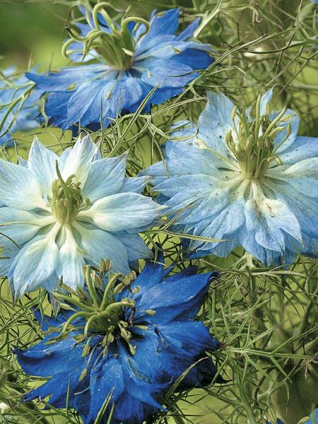 Variété de nigelle de Damas aux fleurs en différentes teintes de bleu, du bleu profond au bleu très pâle.