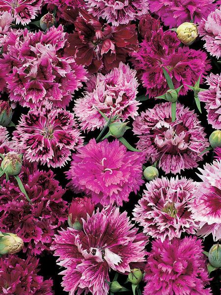 Fleurs très doubles uni ou bicolores, lacérées, de 6 cm de diamètre, très parfumées, dans les tons rose à pourpre.