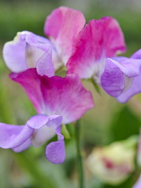 Variété récente de pois de senteur aux grandes fleurs légèrement parfumées, en chamarré de lavande, rose et crème. Peut-être cultivée en suspension ou sur un support.