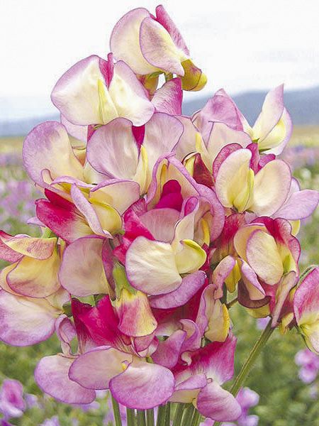 Superbe variété de pois de senteur aux grosses grappes de fleurs au parfum d'antan, tricolores, jaune crème, rose soutenu et lilas. Peut-être cultivée en suspension ou sur un support.