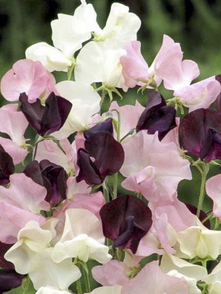 Association de trois variétés de pois de senteur aux grandes fleurs parfumées, blanches, rose pâle et pourpre. Peut-être cultivée en suspension ou sur un support.
