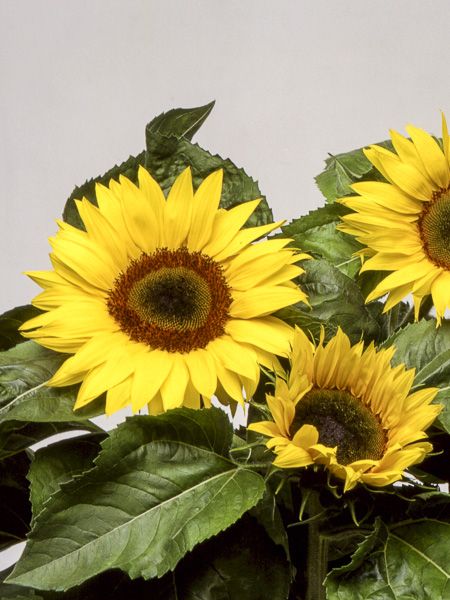 Fleurs de 15-20 cm de diamètre, jaune d'or au cœur brun.