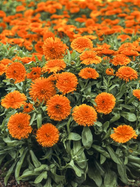 Souci nain et compact, aux fleurs doubles en pompon, orange vif.