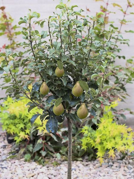 Poirier nain, bien adapté à la culture en pot ou en pleine terre. Poires vertes, à la chair fondante et sucrée.