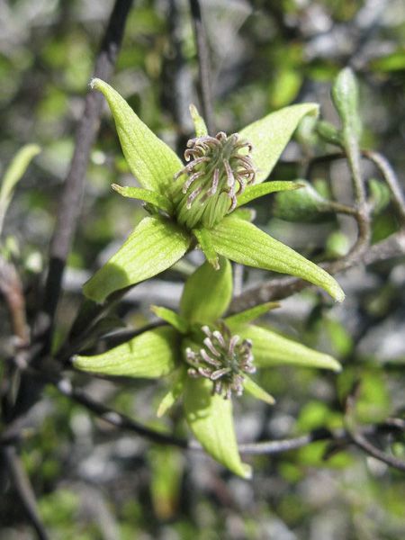 Endémique en Nouvelle-Zélande, cette clématite est ligneuse et son feuillage est persistant et poilu. Elle produit de petites fleurs verdâtres, à 4 tépales, à anthères crème à brunes. Rusticité moyenne. Très original.