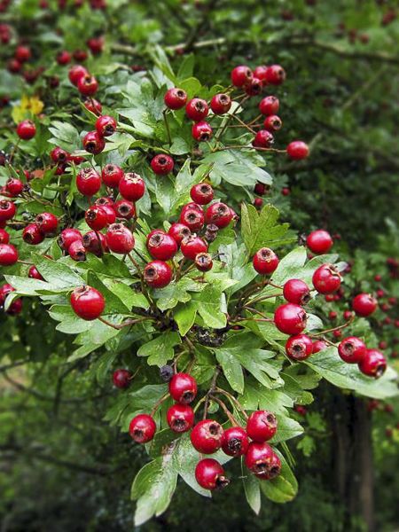 Aubépine aux fleurs simples, blanches, suivies de très nombreux fruits globuleux rouges.