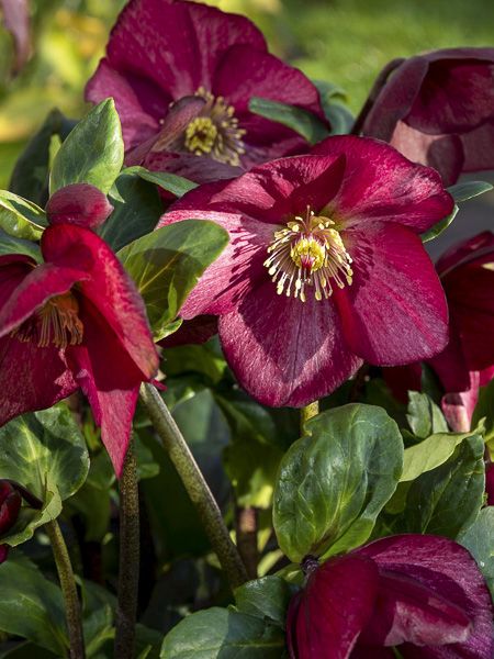 Genre riche d'une quinzaine d'espèces, Helleborus est surtout connu pour son espèce H. niger, la fameuse Rose de Noël. Cette dernière porte bien son nom puisqu'elle peut fleurir de novembre jusque fin mars. Mais d'autres espèces et la mise sur le marché ces dernières années de cultivars colorés permettent de renouveler l'intérêt pour les jardins en hiver. Du joli feuillage persistant et assez coriace émergent de belles fleurs gracieuses, se déclinant du vert au pourpre foncé, en passant par le blanc, le jaune et toutes les nuances de rose. Leur longue floraison est un atout supplémentaire, tout comme la bonne tenue des fleurs en vase. Plante vivace à racines charnues voire tubéreuses pour certaines, l'hellébore aime les terres riches, humifères, fraîches et plutôt neutres. Elle pousse bien en sol argileux mais il faut quil soit bien drainé. Leau stagnante peut la faire pourrir. Les hellébores (sauf H. argutifolius et H. foetidus qui aiment le soleil) préfèrent les situations mi-ombragées, alors une plantation sous l'ombre claire de grands feuillus les comblent. Ce sont des plantes faciles à vivre mais qu'il ne faut pas stresser. Ces vivaces ont aussi la réputation d'être casanières : une fois bien installées, elles n'aiment pas être transplantées. Les jeunes plantes peuvent mettre 2 à 3 ans avant de fleurir, parfois plus, mais ensuite, il n'y aura plus de problème. Elles forment alors de jolies touffes. Etonnamment, les fleurs persistent longtemps. Au fil des semaines, leur couleur fonce mais elles ne fanent pas comme la plupart des fleurs, elles se dessèchent plutôt. La multiplication se fait par division de souche pour toutes les hellébores sauf H. argutifolius et H. orientalis qui se ressèment sans problème. Attention : toutes les parties des hellébores sont très toxiques. Il est conseillé de mettre des gants pour en cueillir les fleurs ou lorsq'uil faut les transplanter. Elles contiennent, entre autres, des saponosides, de l'hellébroside, un hétéroside, à action neurotoxique et cardiotoxique.